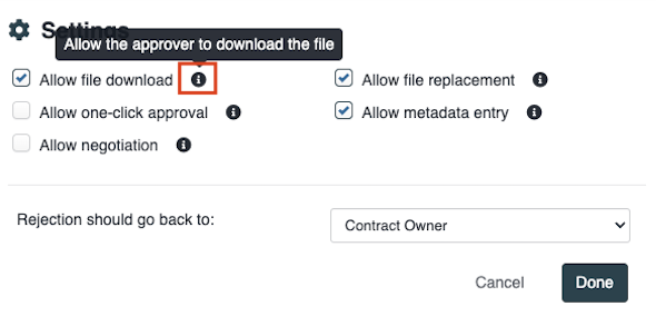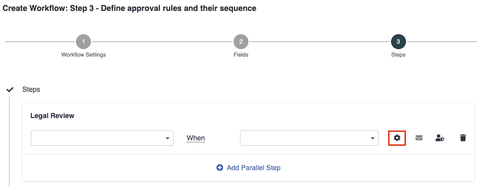 Click on the “Settings” icon to enable permissions for the approver to perform certain tasks in the approval process.