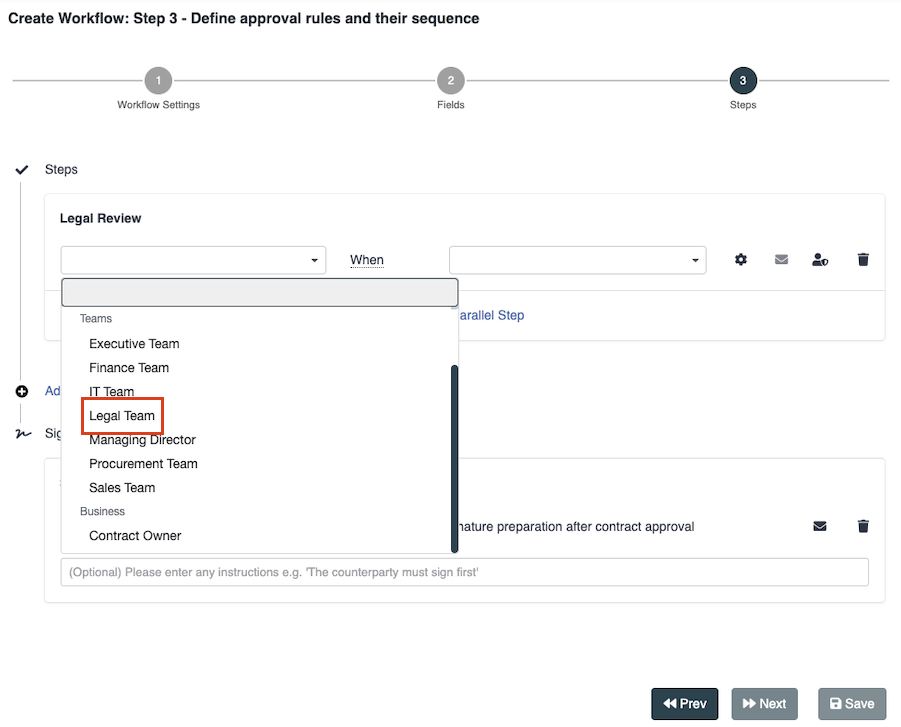 Click the “Add” button. Then, select the approver from the drop-down menu. This could be any of the teams that you created using the steps outlined earlier, such as, for example, the legal team.