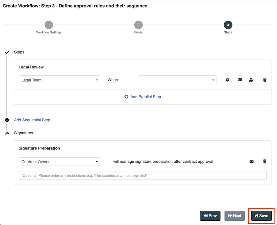 When you have added all steps in the approval sequence, click on the “Save” button.