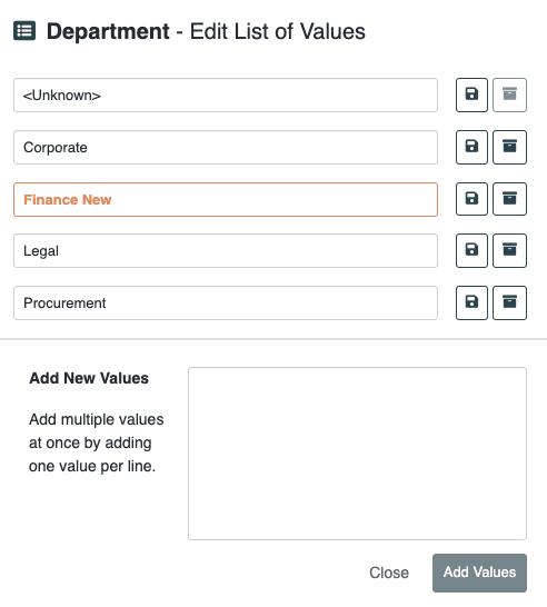 The effect of this would be that "Corporate" could no longer be selected as a value. However, existing documents with a Department of "Corporate" would still display that value, to accurately reflect the historical record.