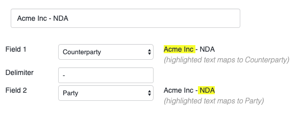 If you have manually named your files using a certain naming convention, you can map segments of your filenames to fields. In the following example of "Acme Inc - NDA", the text before the dash (Acme Inc) is mapped to Counterparty, and the text after the dash (NDA) is mapped to Title: